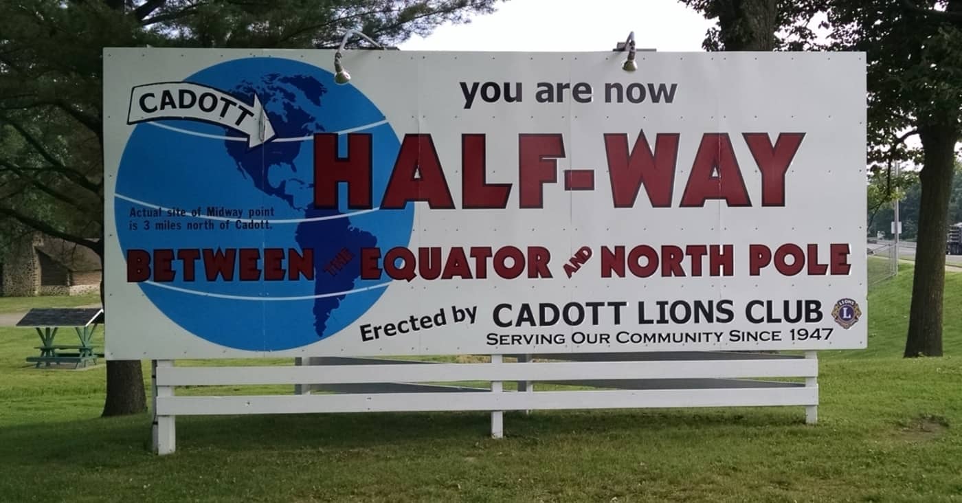 Cadott, Wisconsin. Population 1,445. Halfway between the equator and the north pole. A giant sign in a nice little park lets all passers-by know just where they are.